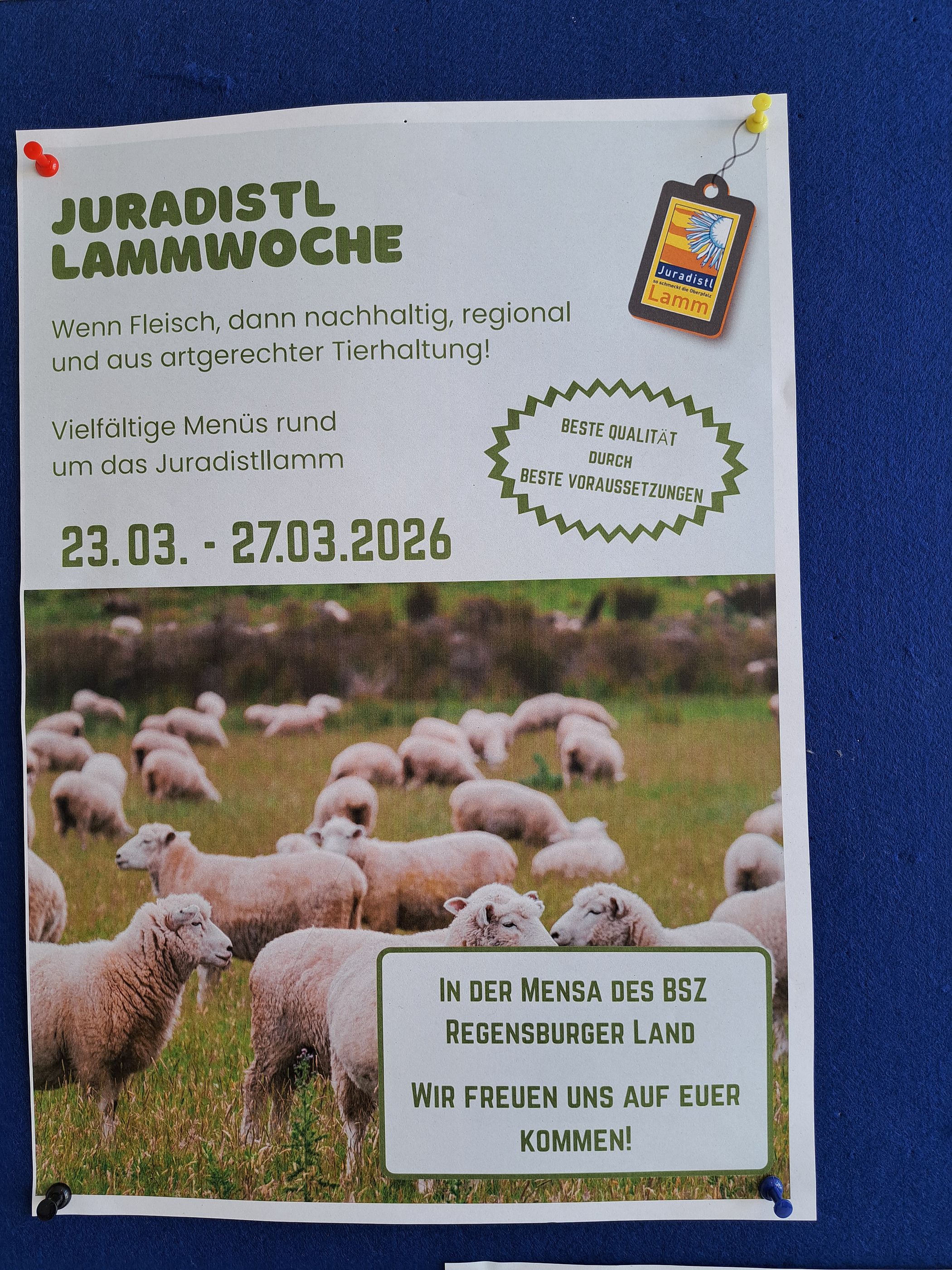 Juradistl-Lamm und Juradistl-Weiderind, die regionalen Naturschutzprodukte des Oberpfälzer Jura, kommen im Juni und Juli in den Mensen des Studentenwerks Niederbayern/Oberpfalz auf den Tisch. Bis zum Ende des Sommersemesters werden jeden Mittwoch an den „Tagen der Nachhaltigkeit“ Produkte aus der Region angeboten. Die extensive Weidehaltung von Schafen und Rindern leistet einen wichtigen Beitrag zum Erhalt der heimischen Natur- und Artenvielfalt. Das Studentenwerk hilft dabei tatkräftig mit!