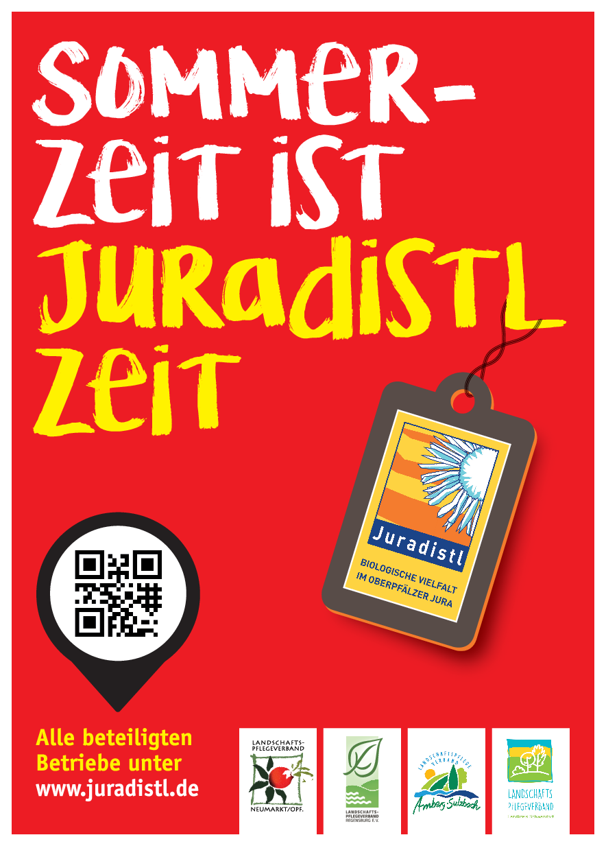 Unter dem Motto „Sommerzeit ist Juradistl-Zeit“ rücken die Landschaftspflegeverbände vom 18. Juli bis 16. August 2020 die Juradistl-Produkte Juradistl-Lamm, Juradistl-Weiderind, Juradistl-Apfelschorle und Juradistl-Honig in den Fokus. Gleichzeitig wollen sie mit dieser Aktion die Juradistl-Partnerbetriebe in der Gastronomie, im Metzgerhandwerk sowie im Getränkehandel und damit natürlich auch die Juradistl-Landwirte, Schäfer und Imker unterstützen.