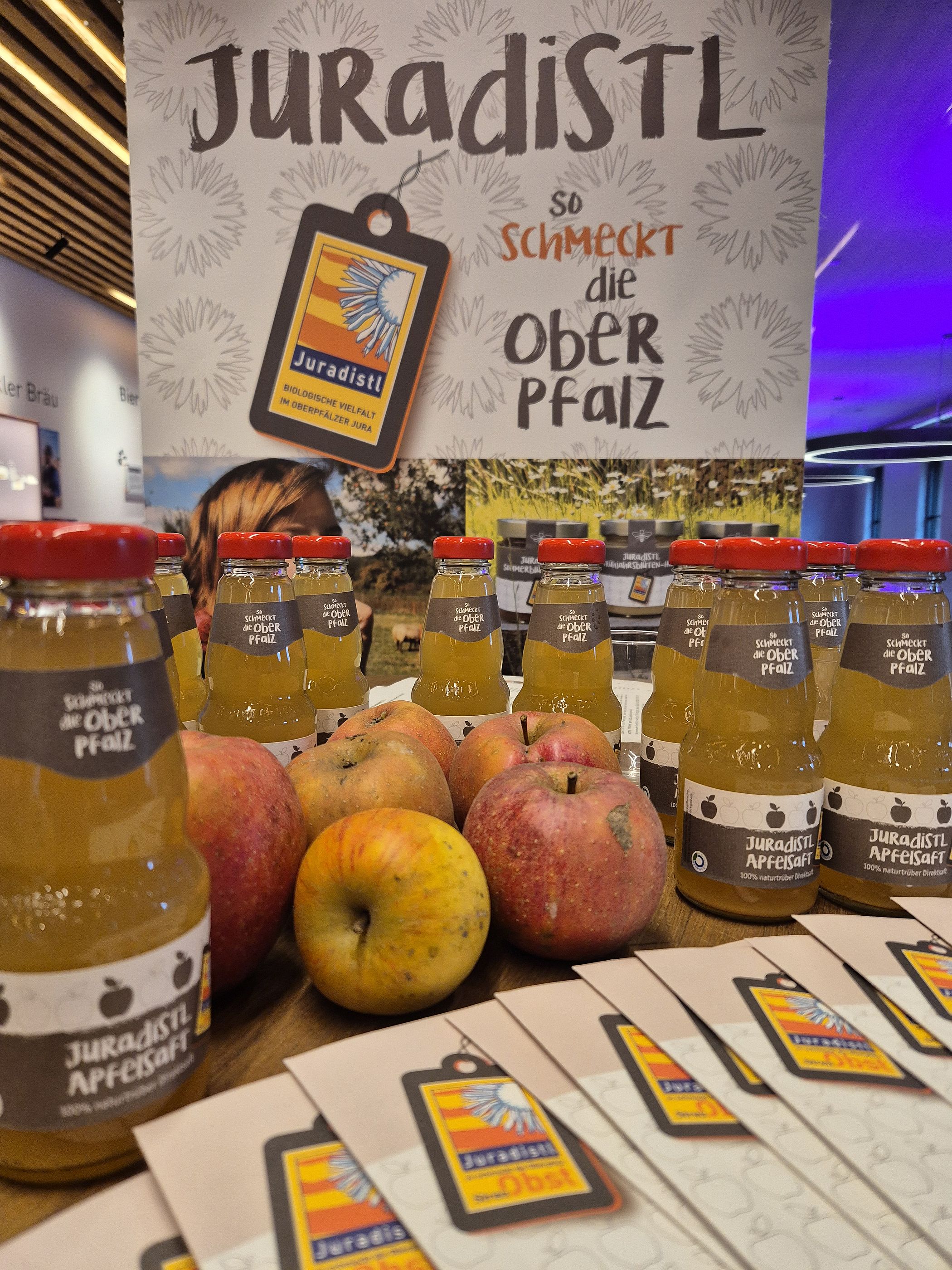 Feinste Äpfel aus der Juradistl-Region von Streuobstwiesen, die ungespritzt und mit einer überwältigenden Sortenvielfalt für den unvergleichbar guten Geschmack des Saftes sorgen: Das zeichnet den neuen Juradistl-Apfelsaft in seiner naturtrüben Variante aus. Am 20. Oktober 2024 wurde anlässlich des Regensburger Regionalmarktes in Lappersdorf im Beisein von Landrätin Tanja Schweiger und am 18. November 2024 im Gutshofhotel Winkler Bräu in Lengenfeld zusammen mit weiteren Beteiligten an dieser Produktentwicklung das neue Juradistl-Produkt vom Vorsitzenden des Landschaftspflegeverbands Neumarkt i.d.OPf., Landrat Willibald Gailler, vorgestellt.