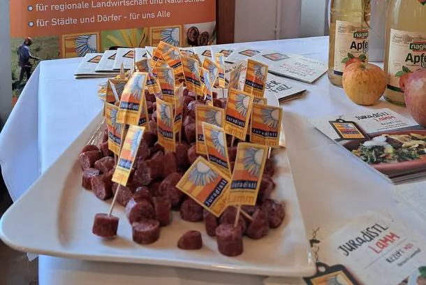 Juradistl, eines der größten bayerischen Biodiversitätsprojekte, getragen von den Landschaftspflegeverbänden Amberg-Sulzbach, Neumarkt i. d. OPf., Regensburg und Schwandorf sowie der Regierung der Oberpfalz, präsentierte dabei Kostproben vom Juradistl-Lamm sowie die Juradistl-Apfelsaftschorle und informierte über das Projekt.